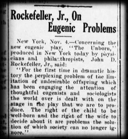 The article, “Rockefeller, Jr., On Eugenic Problems,” is about a play produced by the Rockefellers called “The Unborn.” Jr. says: