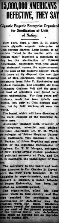 This one discusses the joint eugenics venture between Mrs. E.H. Harriman (mother of future statesman and Skull & Bones secret society member Averill Harriman); John D. Rockefeller; Andrew Carnegie; and scientist Alexander Graham Bell, the guy who invented the telephone and who was apparently a huge eugenicist.