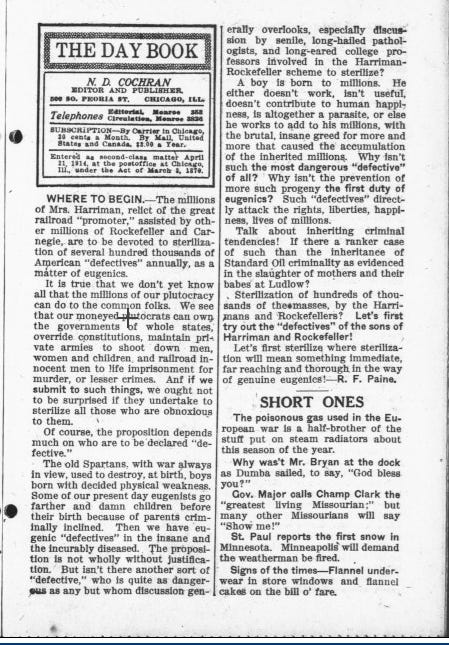 Even at a time when eugenics was en vogue, not everyone was on board with targeting the poorest and most vulnerable in society in a world run by Rockefeller wealth. In the October 8th, 1915 edition of The Day Book, R.F. Paine made just such a case:
