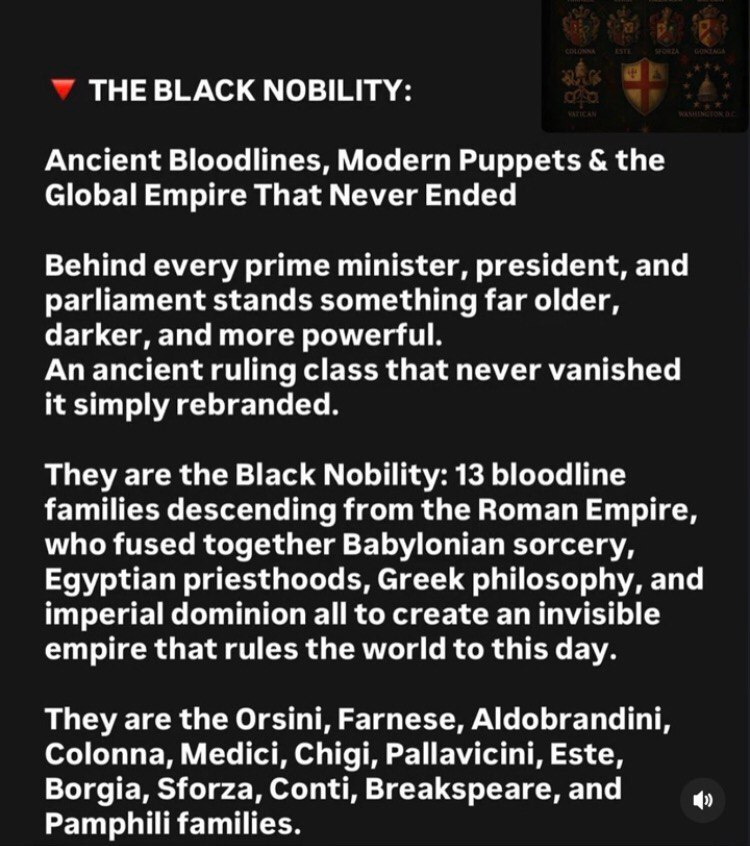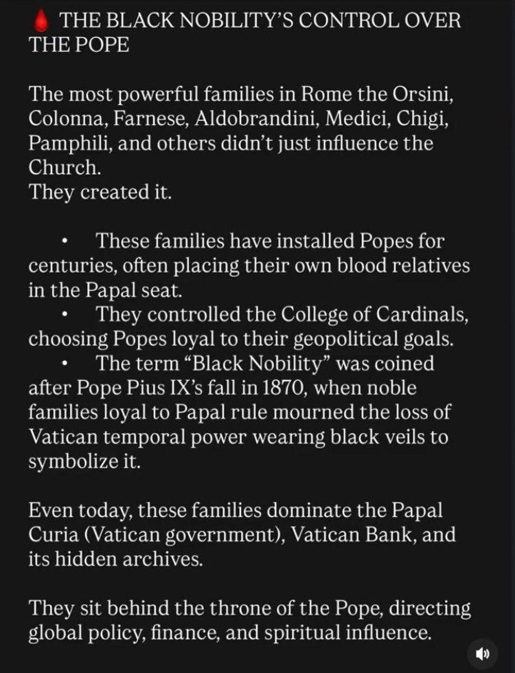 The term “Black Nobility” was coined after Pope Pius IX’s fall in 1870, when noble families loyal to papal rule mourned the loss of Vatican temporal power by wearing black veils to symbolize it. Even today, these families dominate the Papal Curia, Vatican Government, Vatican Bank and its hidden archives. They sit behind the throne of the Pope, directing global policy, finance and spiritual influence.