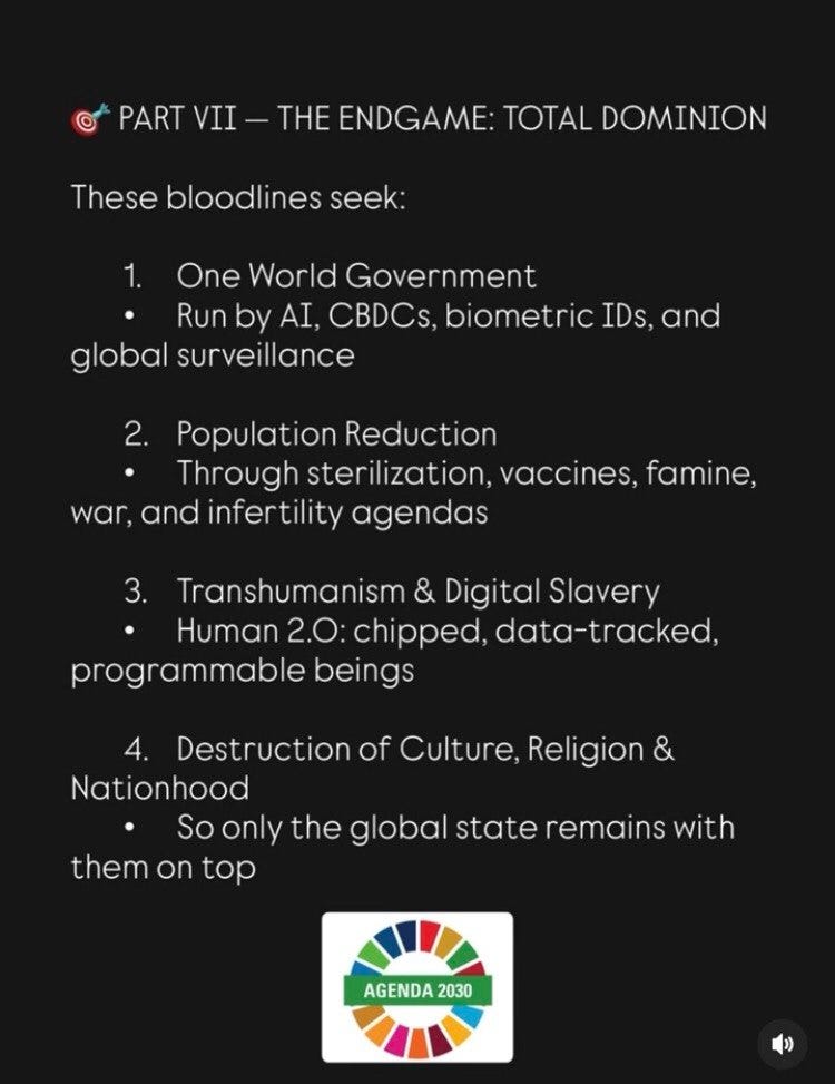 These bloodlines seek a one-world government run by AI, CBDCs, biometric IDs and global surveillance. Population reduction is pursued through sterilization, vaccines, famine, war and infertility agendas. Transhumanism and digital slavery create “Human 2.0” — chipped, data-tracked, programmable beings.
