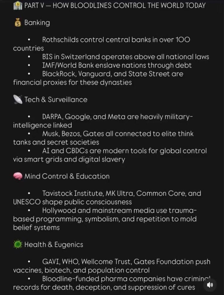 Technology and Surveillance: DARPA, Google and Meta are deeply linked to military intelligence. Musk, Bezos and Gates are connected to elite think tanks and secret societies. AI and central bank digital currencies are modern tools for global control through smart grids and digital slavery.