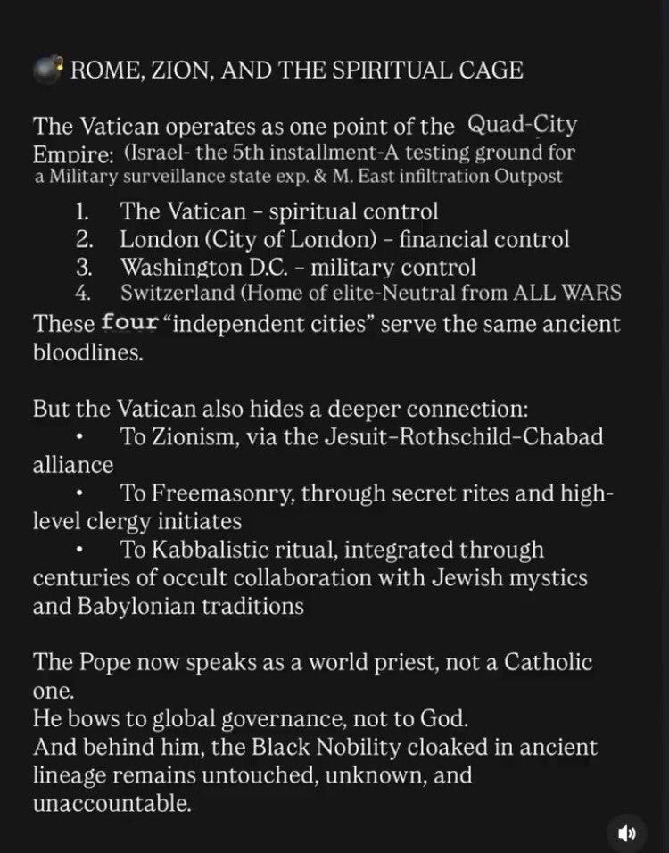 These four independent cities serve the same ancient bloodlines. But the Vatican also hides a deeper connection to Zionism via the Jesuit–Rothschild–Chabad alliance; to Freemasonry through secret rites and high-level clergy initiates; and to Kabbalistic ritual, integrated through centuries of occult collaboration with Jewish mystics and Babylonian traditions.