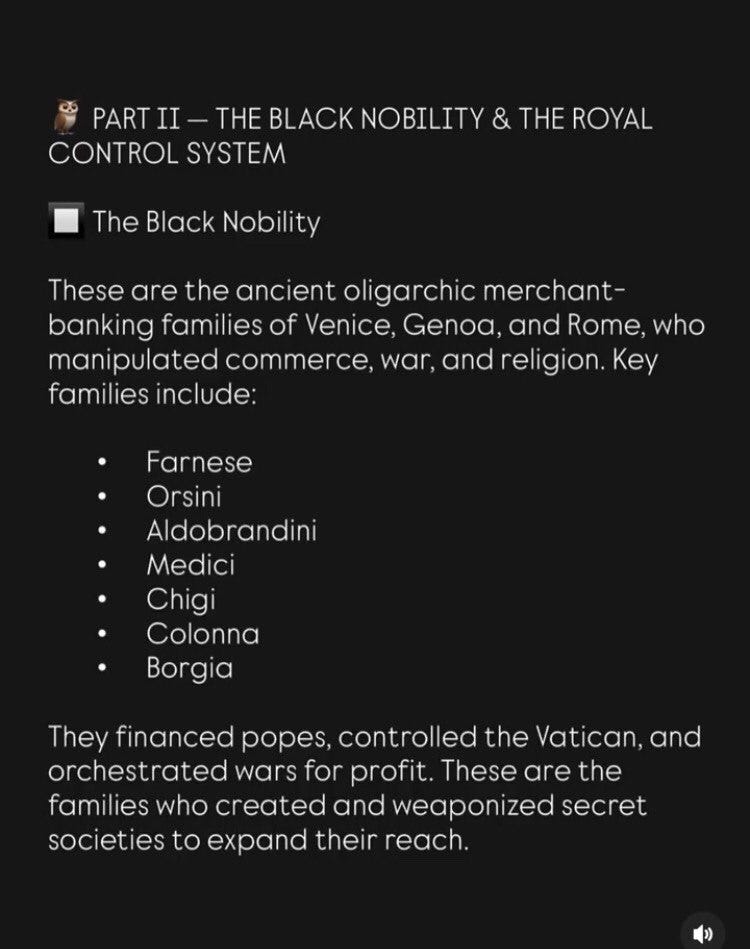 These ancient oligarchic merchant-banking families of Venice, Genoa and Rome manipulated commerce, war and religion. Key families include Farnese, Orsini, Aldobrandini, Medici, Chigi, Colonna and Borgia. They financed popes, controlled the Vatican and orchestrated wars for profit. These families also created and weaponized secret societies to expand their reach.