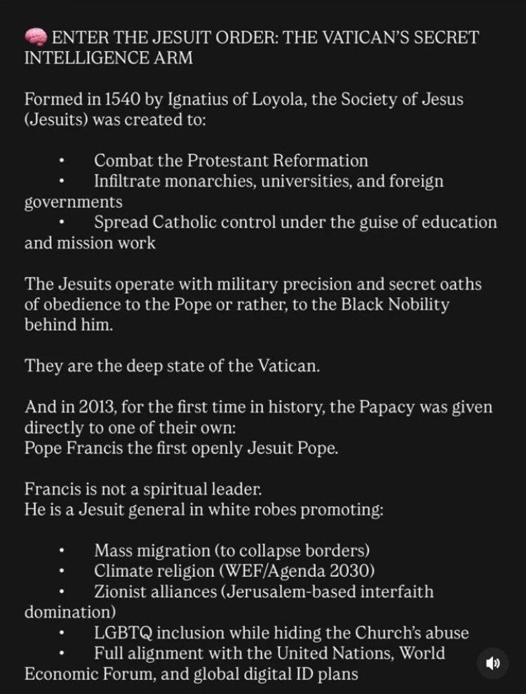 Enter the Jesuit Order — the Vatican’s secret intelligence arm. Formed in 1540 by Ignatius of Loyola, the Society of Jesus was created to combat the Protestant Reformation, infiltrate monarchies, universities and foreign governments, and spread Catholic control under the guise of education and missionary work. The Jesuits operate with military precision and take a secret oath of obedience to the Pope — or rather, to the Black Nobility behind him. They are the deep state of the Vatican.