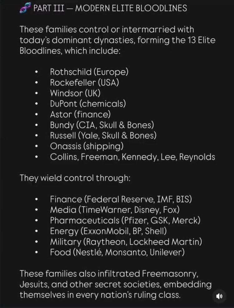 They wield control through finance (Federal Reserve, IMF, BIS), media (Time Warner, Disney, Fox), pharmaceuticals (Pfizer, GSK, Merck), energy (ExxonMobil, BP, Shell), the military (Raytheon, Lockheed Martin) and food (Nestlé, Monsanto, Unilever). These families also infiltrated Freemasonry, Jesuits and other secret societies, embedding themselves in every nation’s ruling class.