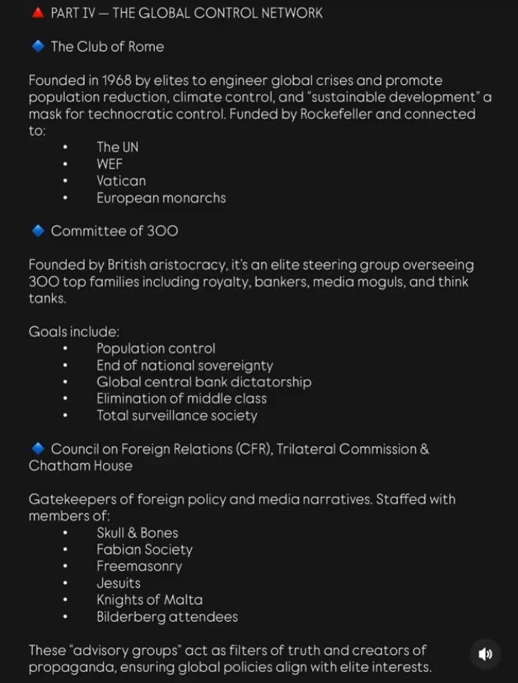 The Council on Foreign Relations, Trilateral Commission and Chatham House act as gatekeepers of foreign policy and media narratives, staffed with members of Skull and Bones, the Fabian Society, Freemasonry, the Jesuits, the Knights of Malta and Bilderberg attendees. These advisory groups filter truth and create propaganda, ensuring global policies align with elite interests.