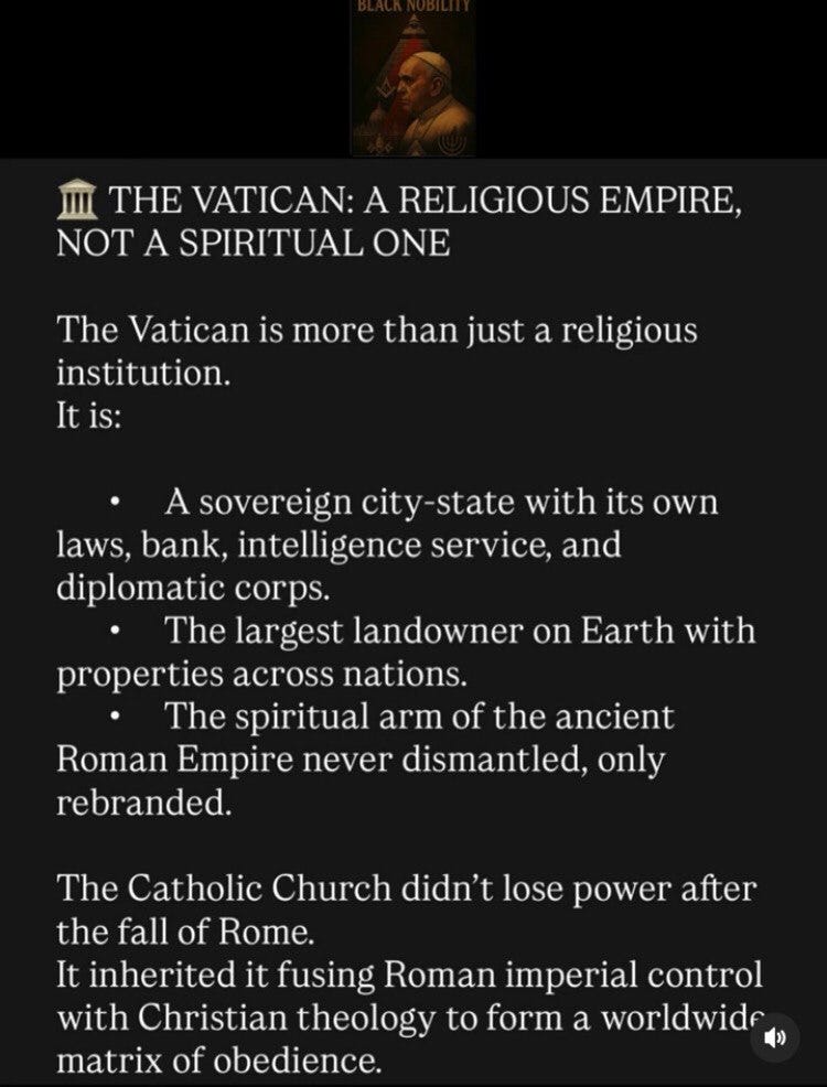 The Vatican is more than just a religious institution. It is a sovereign city-state with its own laws, bank, intelligence service and diplomatic corps — the largest landowner on earth, with properties across nations. It is the spiritual arm of the ancient Roman Empire, never dismantled, only rebranded.