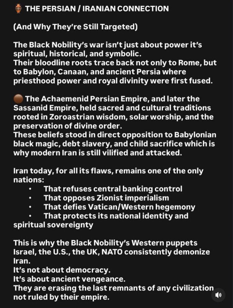 For all its flaws, Iran is one of the only nations that refuses central bank control, opposes Zionist imperialism, defies Vatican-Western hegemony and protects its national identity and spiritual sovereignty. This is why the Black Nobility’s Western puppets — Israel, the US, the UK and NATO — consistently demonize Iran. It is not about democracy; it is about ancient vengeance. They are erasing the last remnants of any civilization not ruled by their empire.